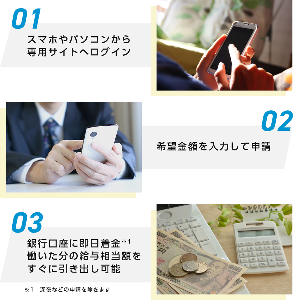 従業員が経費を自費で立替えることなく、随時申請して受け取ることが出来るシステムです。出張交通費や会食費用など、営業経費の立替による従業員負担を解消します。